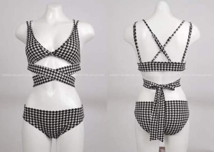 即納 チェック 千鳥柄 水着 クロス ビキニ 韓国 リボン ウエストカット シアー パンツ 韓国 モノキニ ワンピース 水着 体型カバー